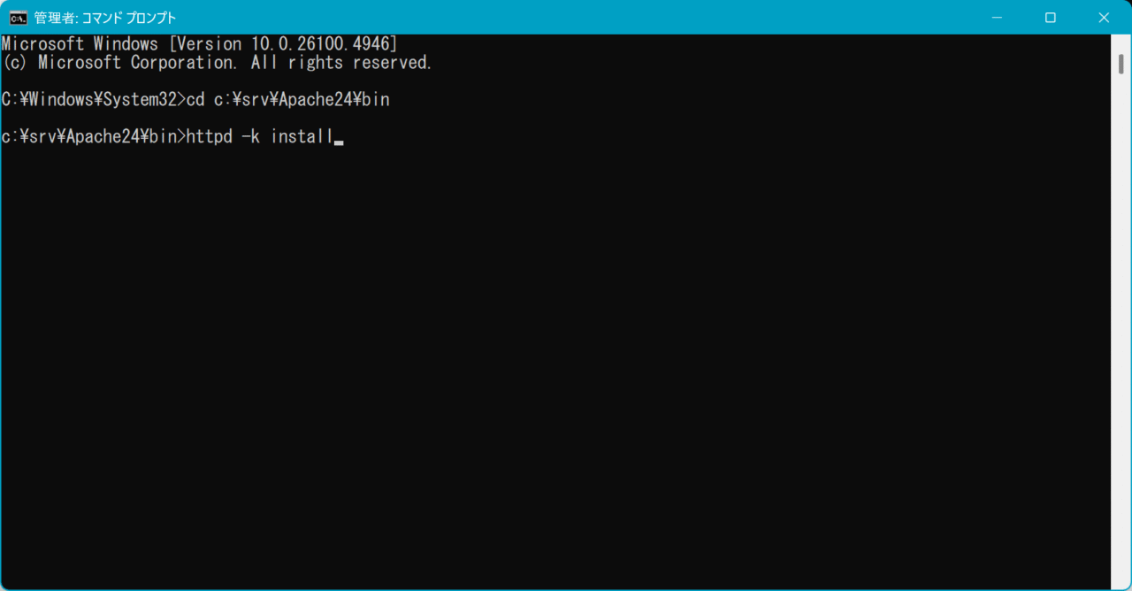 コマンドプロンプトにて上記と同じく「httpd.exe」まで移動(管理者権限)
