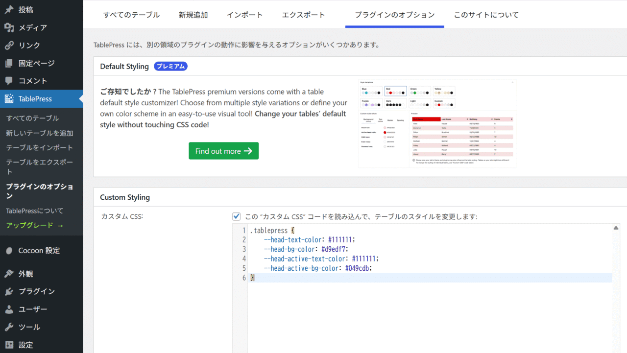 TablePressには専用の変数を使ったCSSコードを入力する欄があります