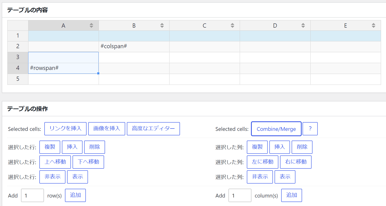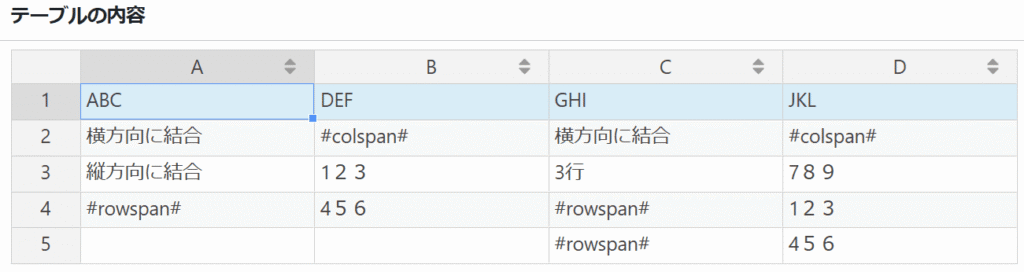 選択した最後のセルに「#colspan#」「#rowspan#」の文字が入ります