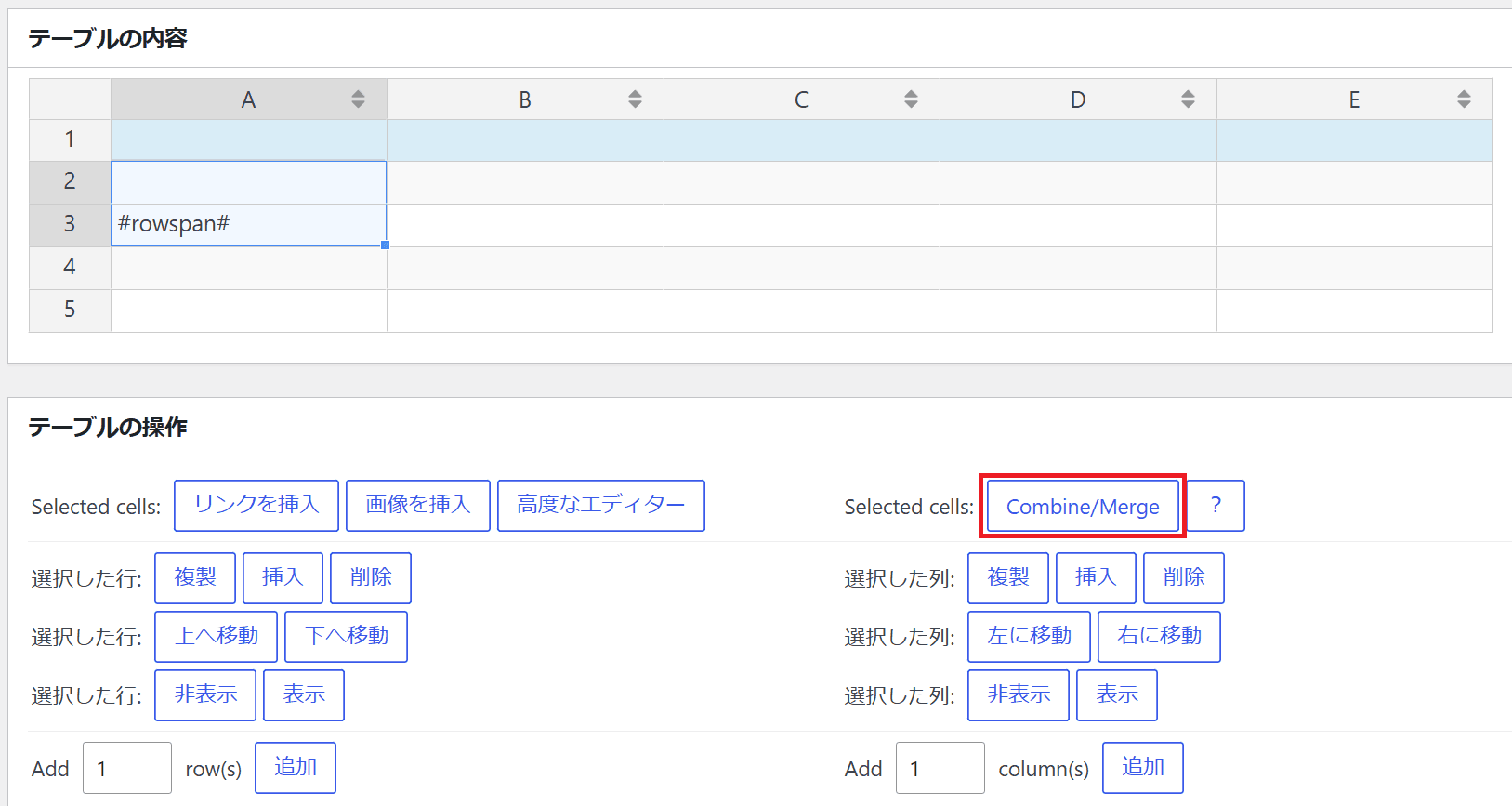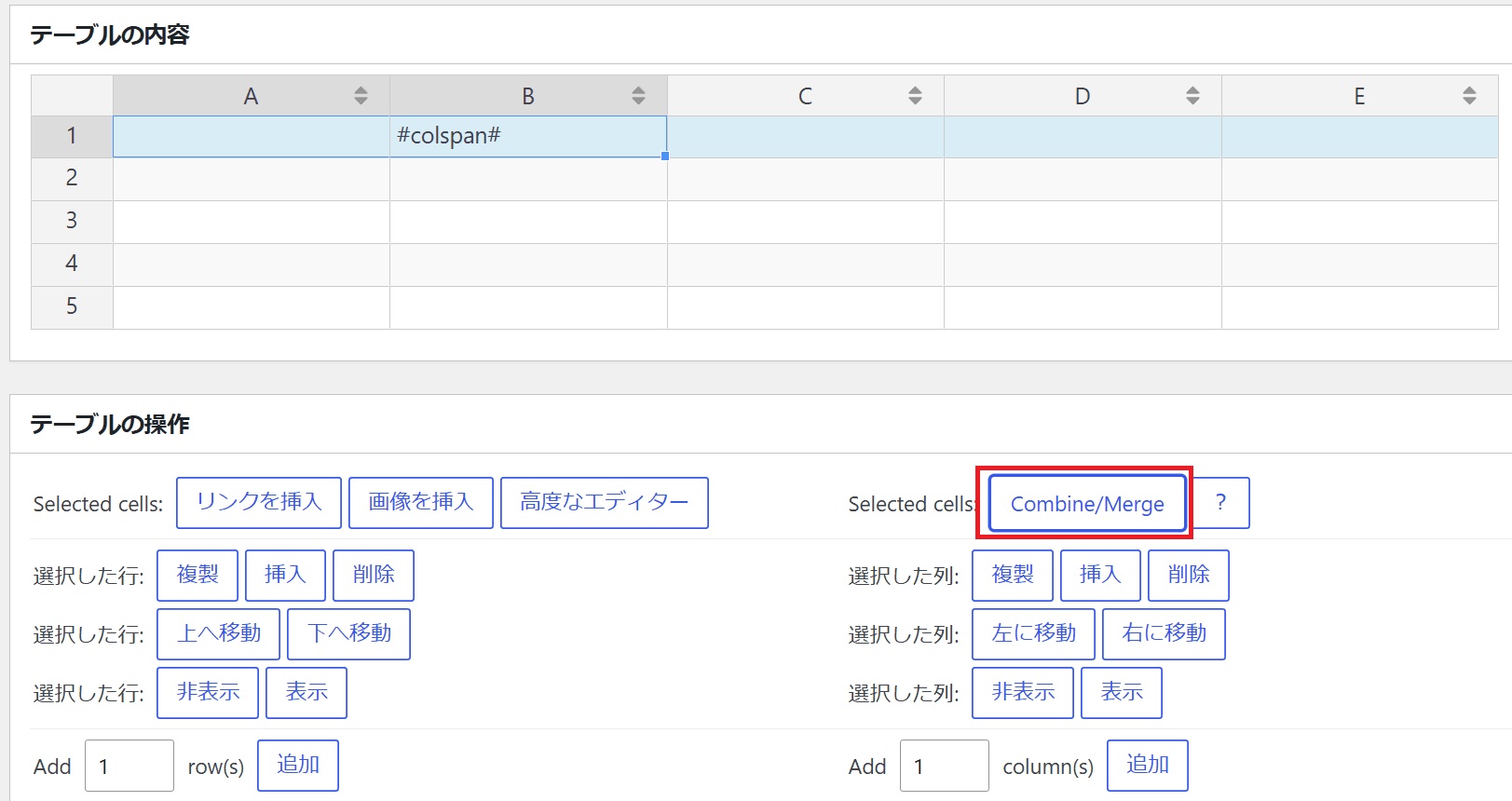 右上の「Combine/Merge」はセルの結合に使います。