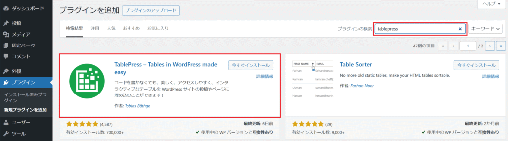 右上にある「プラグインの検索」部分に「tablepress」を入力。暫くして一覧が表示されます
