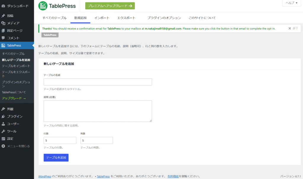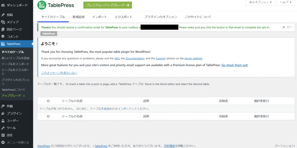 ”ありがとうございますTablePress の確認メールが (メールアドレス) のメールボックスに届きます。メール内のボタンをクリックして、オプトインを完了してください。”